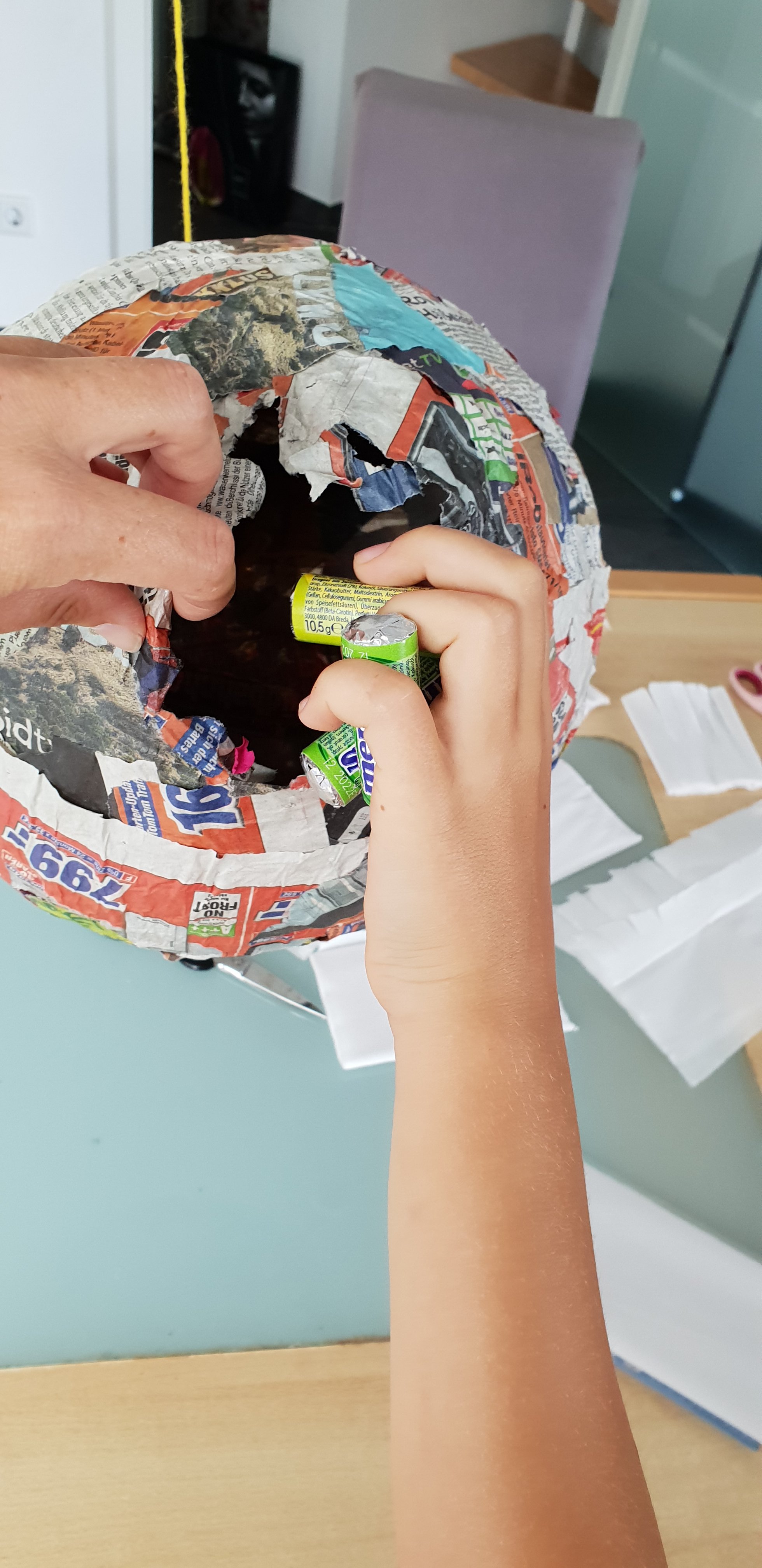 Jetzt heißt es mindestens einen Tag warten, bis alles gut trocken ist. Dann unten ein Loch reinschneiden und einen Faden durchziehen und oben durch ein kleines Loch aufhängen. Die Ballonreste könnt ihr dann rausholen und abziehen. Jetzt befüllt ihr das ganze mit Süßgkeiten und klebt über das Loch wieder ein Stück Pappe.