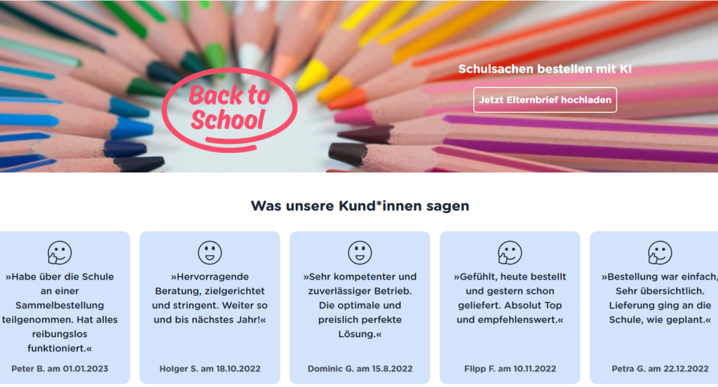Zuerst öffnet ihr die Website und die entsprechende Seite zum Bestellen von Schulmaterial via Elternbrief.